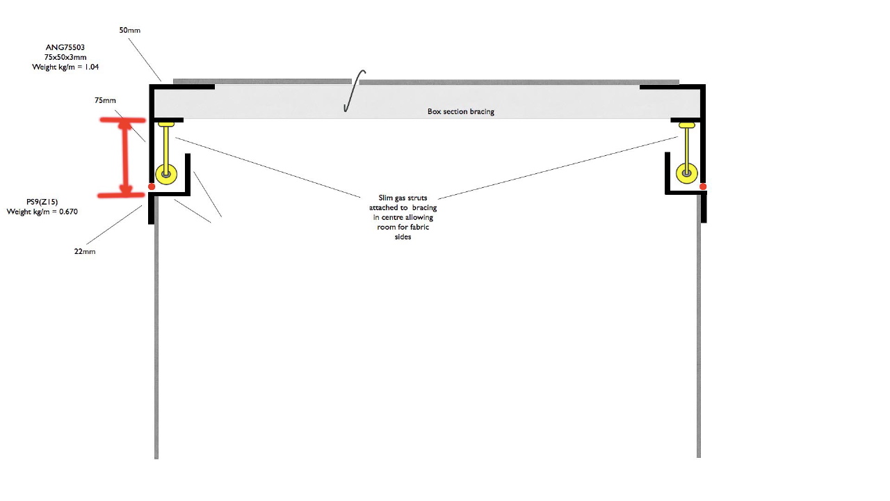I did a wander around the web and eventually found two easily available alloy extrusions that would allow the roof to work - one a Z section that gives a water-resistent upstand to use for the lower section, and the other a long L section to use as the lifting bit. Crucially the combination of these two sections together leaves enough space between their vertical faces to allow the fabric sides to pull inside when closed. The various early drawing are below - the design 'evolved' considerably as it progressed so things like the roof attachment and roof rack design are different in the final version.