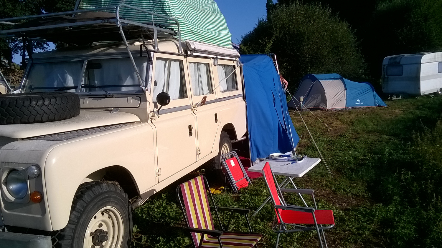 Otherwise, I could make you a simple sheet from marine grade acrylic canvas and you could secure it to a roof rack for example and pull it tight with the front edge supported on three poles (Middle one taller) and guy ropes.