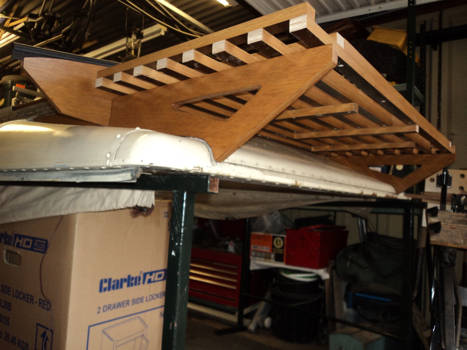I'd already stained the wood on an earlier evening in the house. I have got an aluminium rack that came with the carawagon....but it's only 1.2m by 0.4m, just 4 bars.....and looked home-made rather than factory anyway. I've preferred the wooden ones I've seen so spent the afternoon cutting and screwing. I think it's come out OK. I just need to stain the ends where I've made cuts before I yacht varnish the whole lot. It's got 8 bars and now measures 1.25m by 0.52m......every little helps they say. I've done it early in the project beause I would have rushed and made a mess of it if it was the last thing to do.